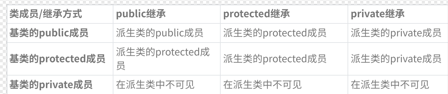 1. 基类private成员在派⽣类中⽆论以什么⽅式继承都是不可⻅的。 这⾥的不可⻅是指基类的私有成员还是被继承到了派⽣类对象中,但是语法上限制派⽣类对象不管在类⾥⾯还是类外⾯都不能去访问它。 (即无法在派生类中显示调用,可以通过在基类中设计一个公有函数进行访问) 2. 基类private成员在派⽣类中是不能被访问,如果基类成员不想在类外直接被访问,但需要在派⽣类中能访问,就定义为protected。 保护成员限定符是因继承才出现的。 3. 基类的私有成员无论任何生成派生类在派⽣类都是不可⻅。 基类的其他成员在派⽣类的访问⽅式 == Min(成员在基类的访问限定符,继承⽅式),public > protected > private。 4. 使⽤ 关键字class时默认的继承⽅式是private ,使⽤ struct时默认的继承⽅式是public , 不过最好显⽰的写出继承⽅式。 注意: 在实际运⽤中⼀般使⽤都是public继承,⼏乎很少使⽤protetced/private继承,也不提倡使⽤protetced/private继承,因为protetced/private继承下来的成员都只能在派⽣类的类⾥⾯使⽤,实 际中扩展维护性不强。