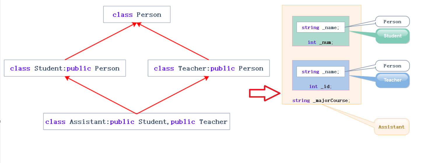 a.Teacher::_name = "wzz";在上面的继承关系中,在Student和Teacher的继承Person时使用虚拟继承(在继承方式前加virtual关键字),即可解决问题。需要注意的是,虚拟继承不要在其他地方去使用。