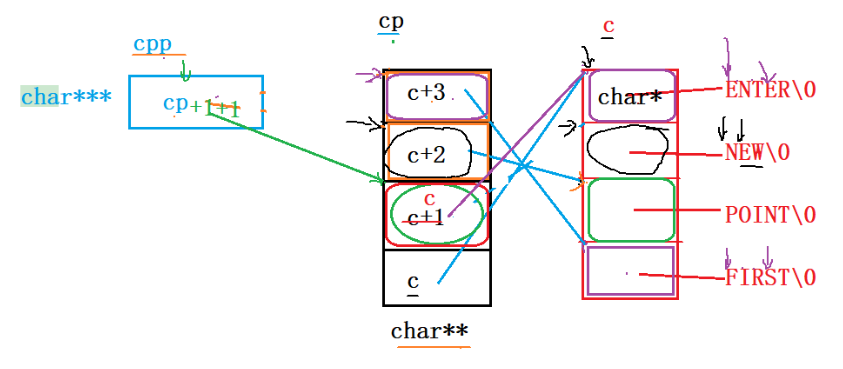 printf("%s\n", **++cpp);++cpp指向c+2的地址,* ++cpp拿出c+2的地址,c+2的地址又指向c 数组里P的地址,再解引用拿到P的地址,所以第一个printf打印出POINT。