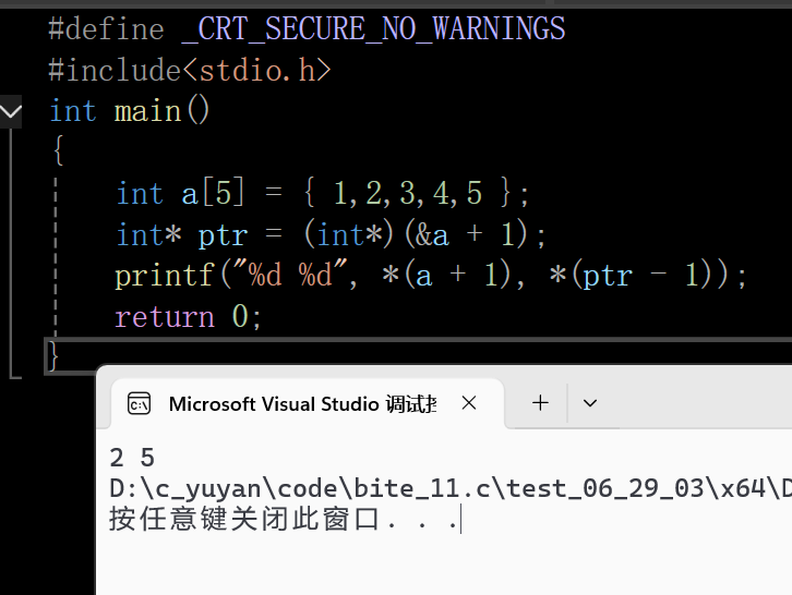 *(ptr1 - 1)这里第一个打印没啥好说的,直接说第二个* (ptr2 - 1),aa数组名表示首元素地址,因为是二维数组,所以aa是第一行的地址,(aa + 1)是第二行一维数组的地址,* (aa + 1)拿到第二行整个数组,相当于数组名,aa[1]数组名又相当于首元素地址。 补充一下:这里(*(aa+1))指向6,6的地址已经是整型地址,这里也不需要强制类型转换了。 打印结果: