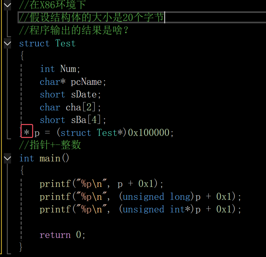 第一个printf:指针加减整数与指针类型有关,结构体指针加1跳过一个结构体,一个结构体20个字节,这是16进制,也就是0x100014。只有指针变量+1,才可以说加几个字节。 第二个printf:这里p本是指针变量,p被强制类型转换为unsigned long,无符号长整型,整数类型,整数加1就是加1,也就是0x100001. 第三个printf:p被强制类型转换为unsigned int*,这时加1,跳过一个无符号整型,4个字节。这时地址是0x100004,这时用%p打印在x86环境下要打印够8个16进制位,32个比特位,前面补两个0,%p不打印0x。
