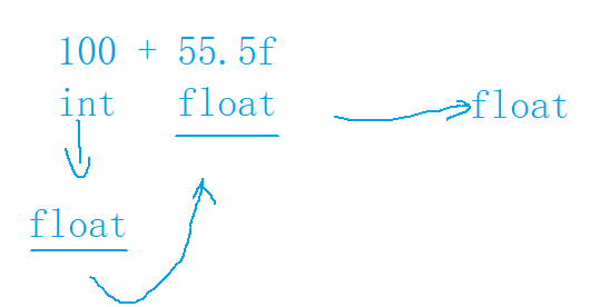 比如这里整型100+浮点型55.5,编译器就会自动将整型100转换为浮点型100,再进行相加和。