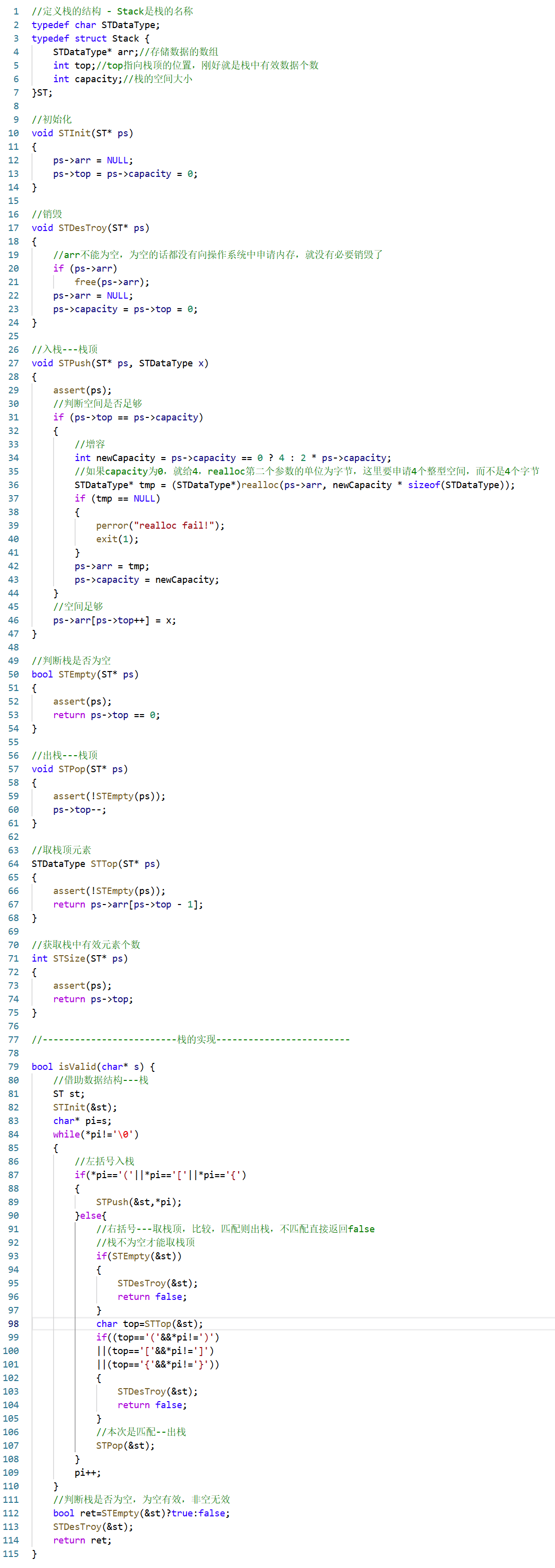 以此类推,循环往复,当pi遍历完字符串,此时栈为空,说明这就是一个有效的字符串