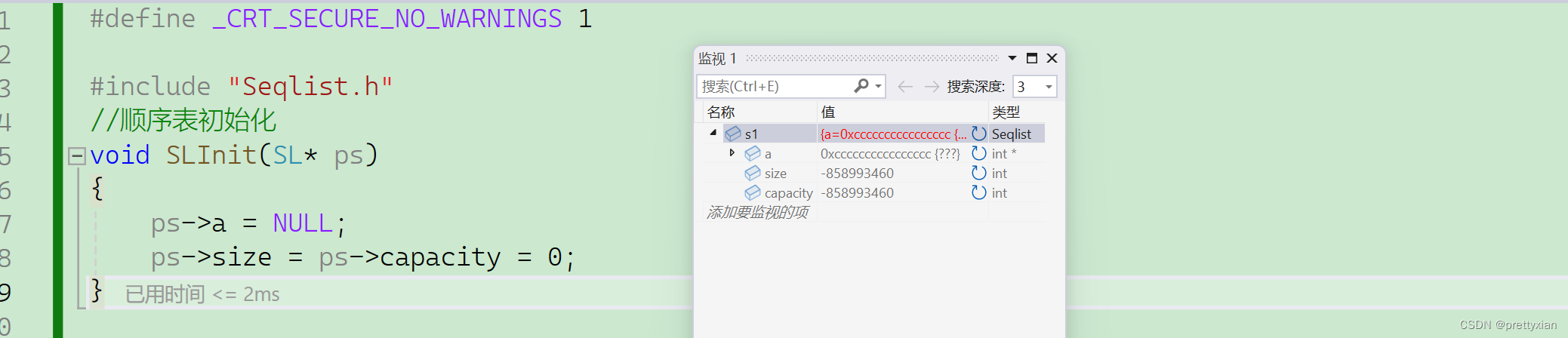 动态的顺序表的实现需要创建3个变量,指针a记录开始的位置;size记录有效数据与的个数;capacity用来记录空间的容量。相比于静态顺序表。动态顺序表的内存是动态开辟的,更加灵活。