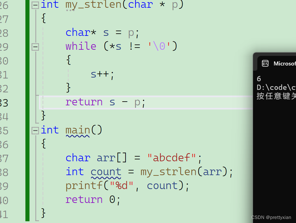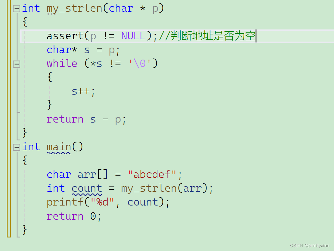 自定义一个函数,利用指针求出字符串的长度,此处数组名arr表示首元素的地址,将地址传给指针p后,会顺着地址一次访问后面地址,直到遇到\0。