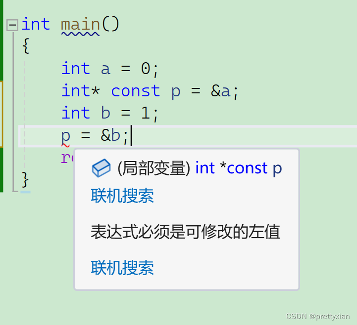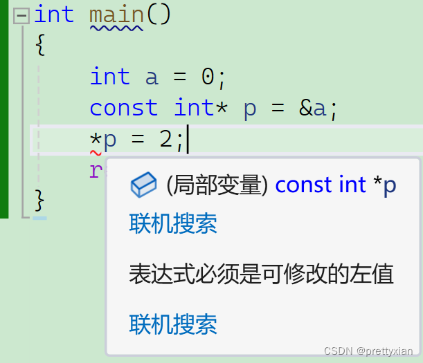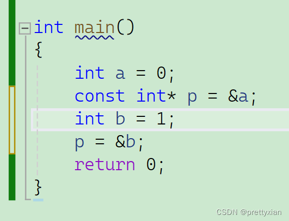 此时恰恰与在*左边相反,限制的是p,不能修改P本身的值,但是p指向的内容是可以改变的