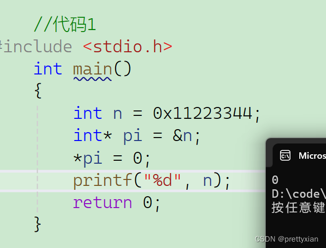代码1中,n的值被改成了0;而代码2中,n的值却变成了287453952。n的4个字节被全部改为了0(int类型有4个字节,32位);而代码2却只将n的第一个字节改成了0。