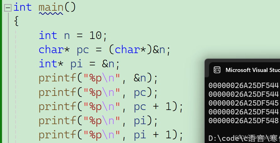 我们可以观察到,pc + 1与pc的地址差1一个字节;而pi + 1与pi的地址相差4个字节。