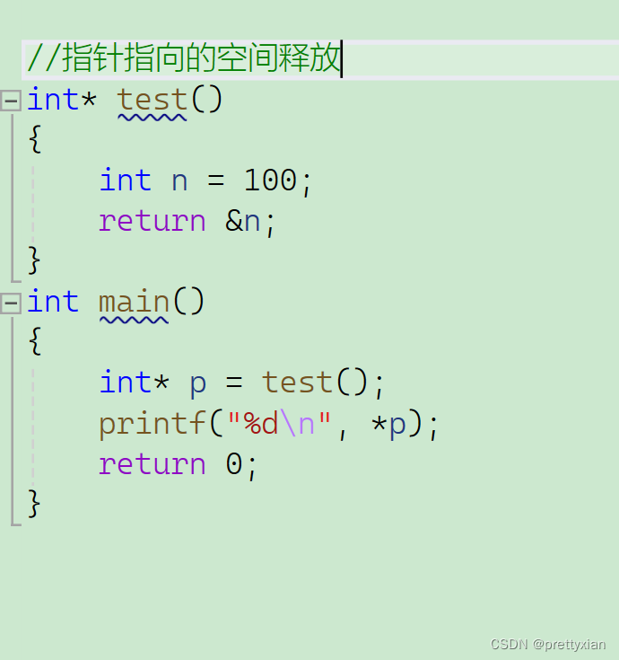 在这段代码中,test 函数试图返回一个指向局部变量 n 的指钨。当 test 函数执行完毕并返回,n 就会被释放,因此返回的指针将指向无效的内存地址。