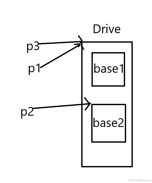将派生类的指针赋值给基类的指针会贴片,p1会指向base1开头,p2会指向base2开头。Drive继承了base1和base2,先继承基类的成员,而base1在base2之前,故Drive以base1开头。