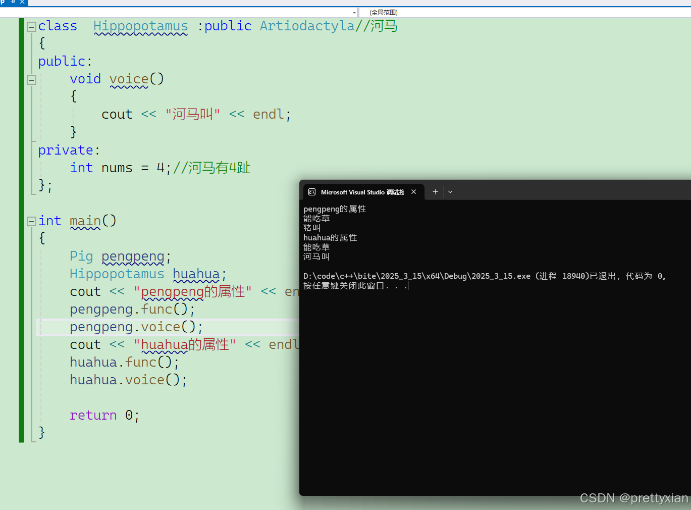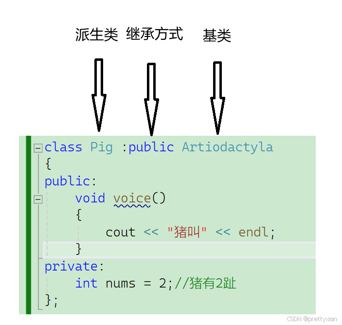 eg.有一只猪彭彭,一只河马花花。他们都是偶蹄目动物。故把偶蹄目作为他们的基类,猪和河马都作为偶蹄目这个基类的派生类,都继承了吃草这个方法。猪和河马有不同。他们不同的属性和方法分别实现在Pig和Hippopotamus这个派生类中。