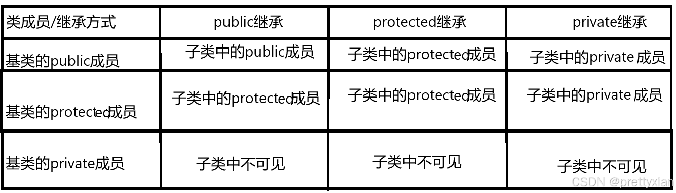 1. 基类private成员在派⽣类中⽆论以什么⽅式继承都是不可⻅的。这⾥的不可⻅是指基类的私有成员还是被继承到了派⽣类对象中,但是语法上限制派⽣类对象不管在类⾥⾯还是类外⾯都不能去访问它。 2. 基类private成员在派⽣类中是不能被访问,如果基类成员不想在类外直接被访问,但需要在派⽣类中能访问,就定义为protected。可以看出保护成员限定符是因继承才出现的。 3. 实际上⾯的表格我们进⾏⼀下总结会发现,基类的私有成员在派⽣类都是不可⻅。基类的其他成员在派⽣类的访问⽅式 == Min(成员在基类的访问限定符,继承⽅式), public > protected>private。 4. 使⽤关键字class时默认的继承⽅式是private,使⽤struct时默认的继承⽅式是public,不过最好显⽰的写出继承⽅式。 5. 在实际运⽤中⼀般使⽤都是public继承,⼏乎很少使⽤protetced/private继承,也不提倡使⽤ protetced/private继承,因为protetced/private继承下来的成员都只能在派⽣类的类⾥⾯使⽤,实 际中扩展维护性不强。