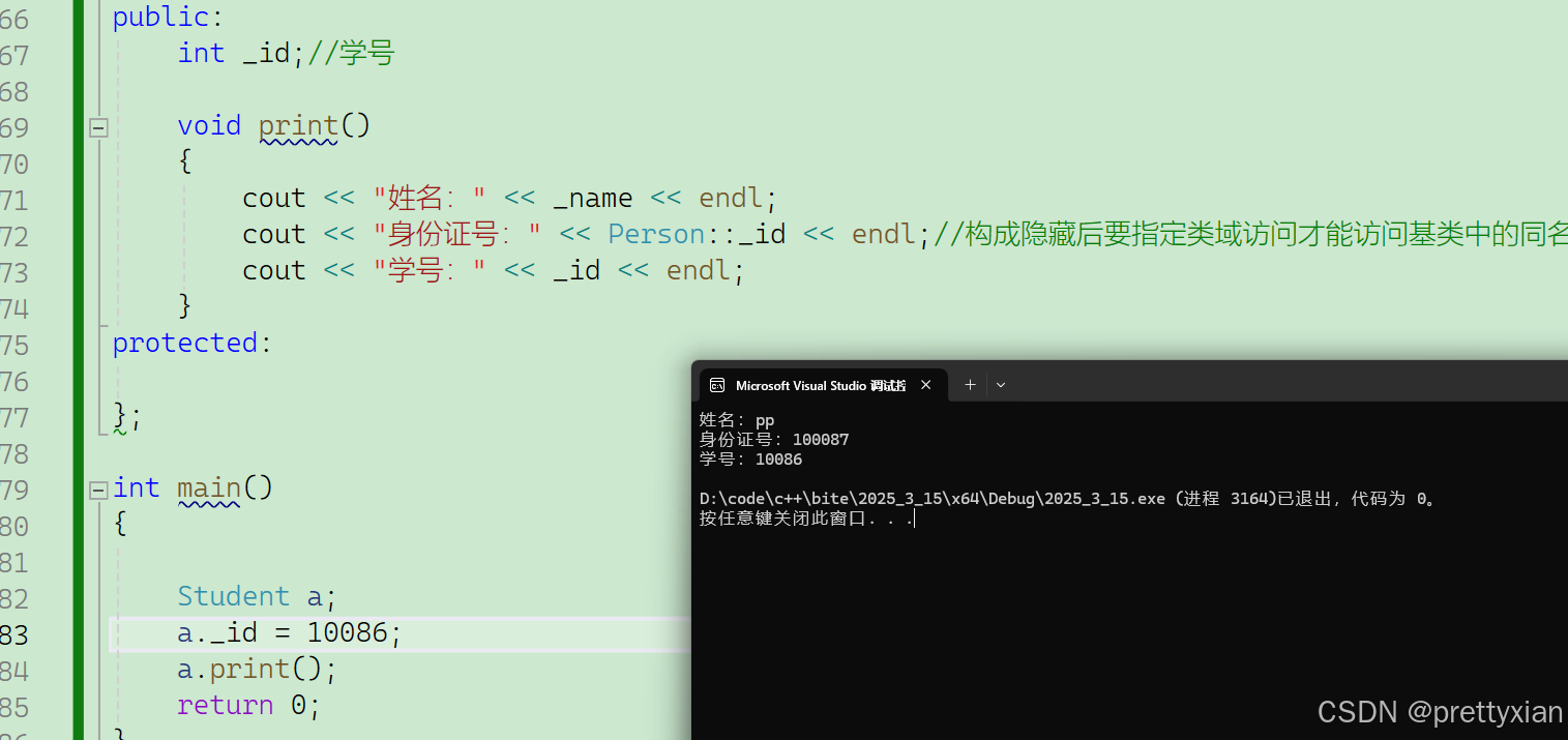 2. 派⽣类和基类中有同名成员,派⽣类成员将屏蔽基类对同名成员的直接访问,这种情况叫隐藏。
