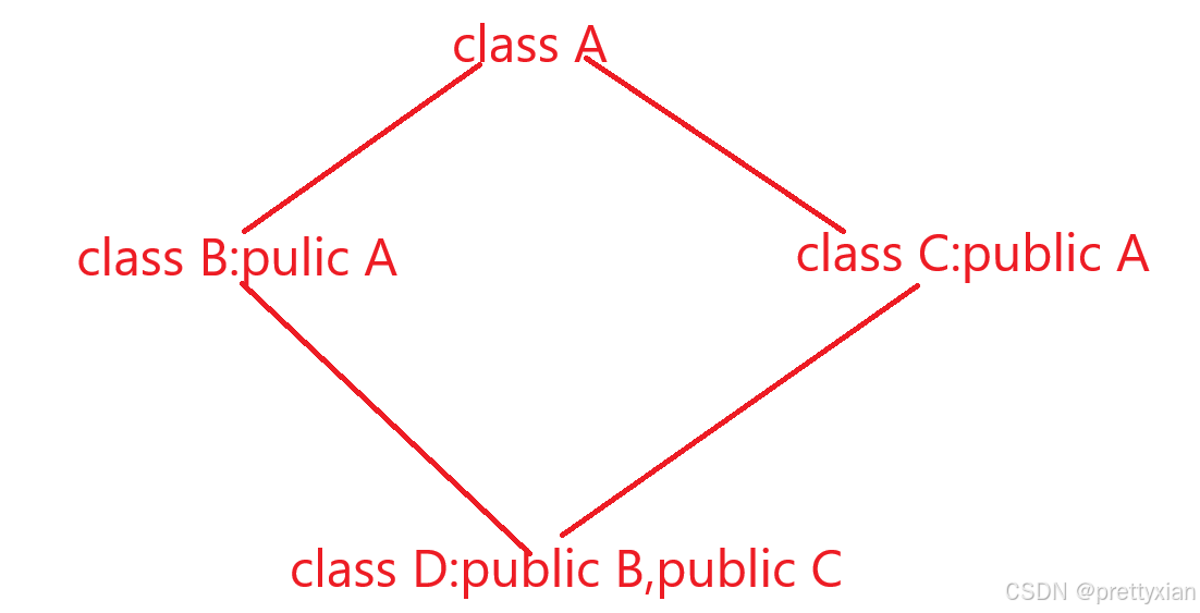 class D : public B, public C {}; // D 继承 B 和 C注意加virtual的位置,如果是普通继承,那么A中的成员会被D继承两份。所以在要在第一个继承A的类型加virtual。