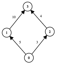 vector<vector<int>> edges = {{0, 1, 5}, {1, 3, 10}, {0, 2, 3}, {2, 3, 4}};