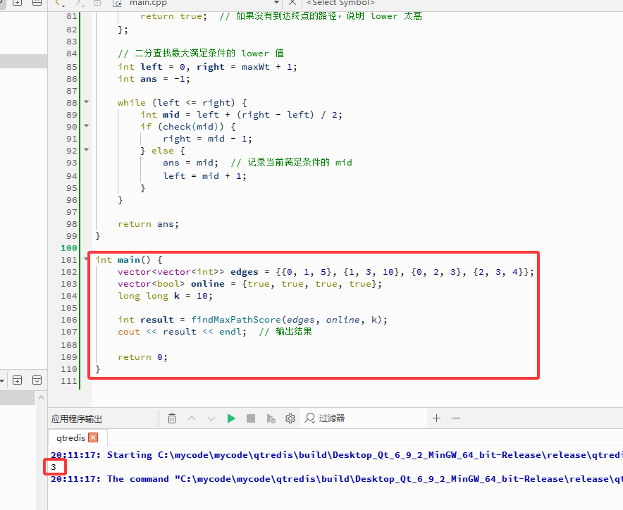 edges 和节点在线状态 online,构建邻接表 g 来表示图。这里有一个关键过滤:只保留起点和终点都在线的边。这意味着,如果一条边的起点或终点节点不在线(除0和n-1外),这条边将不会被加入图中。deg,并记录从节点0出发的边的最大成本 maxWt,为后续的二分搜索确定上界。这一步主要是为了构建一个仅包含有效边的图结构 。L,使得存在一条路径,其上的每条边成本都至少为 L,同时路径总成本不超过 k,并且路径上的中间节点都在线。L。搜索范围的下界是0,上界是步骤1中记录的 maxWt。lower,代码会判断是否存在满足条件的路径。这个过程将原问题转化为了一个判定性问题 。lower,需要在图上进行一次动态规划(实际上计算的是最短路径,但目的用于判定)。lower 的边。f[y] 为从节点0到节点 y 的、只经过在线中间节点且只使用成本大于等于 lower 的边所构成的路径的最小总成本。f[0] 初始化为0,其他节点初始化为一个很大的数(表示不可达)。x,遍历它的所有出边 (x, y, wt)。如果边成本 wt >= lower,则尝试更新 f[y]:f[y] = min(f[y], f[x] + wt)。n-1 时,如果 f[n-1] <= k,说明存在一条路径,其瓶颈值至少为 lower 且总成本满足要求。此时二分搜索会向右移动,尝试更大的 lower 值;否则向左移动 。lower 值,使得判定条件成立。这个值减1(根据 sort.Search 函数的特性)就是最终答案,即所有可行路径中瓶颈边成本的最大值。lower(值为0)都无法找到可行路径,则说明不存在任何可行路径,返回-1。maxWt 是边成本的最大值,最大可达 10^9,因此迭代次数约为 O(30) 次。g、入度数组 deg、动态规划数组 f 以及队列等。该算法的巧妙之处在于通过二分答案将最大化瓶颈值的问题转化为一系列判定问题,并利用DAG的拓扑序特性,在每次判定时使用动态规划来高效地检查是否存在总成本满足约束的路径。预处理步骤则排除了无效节点,优化了计算效率 。