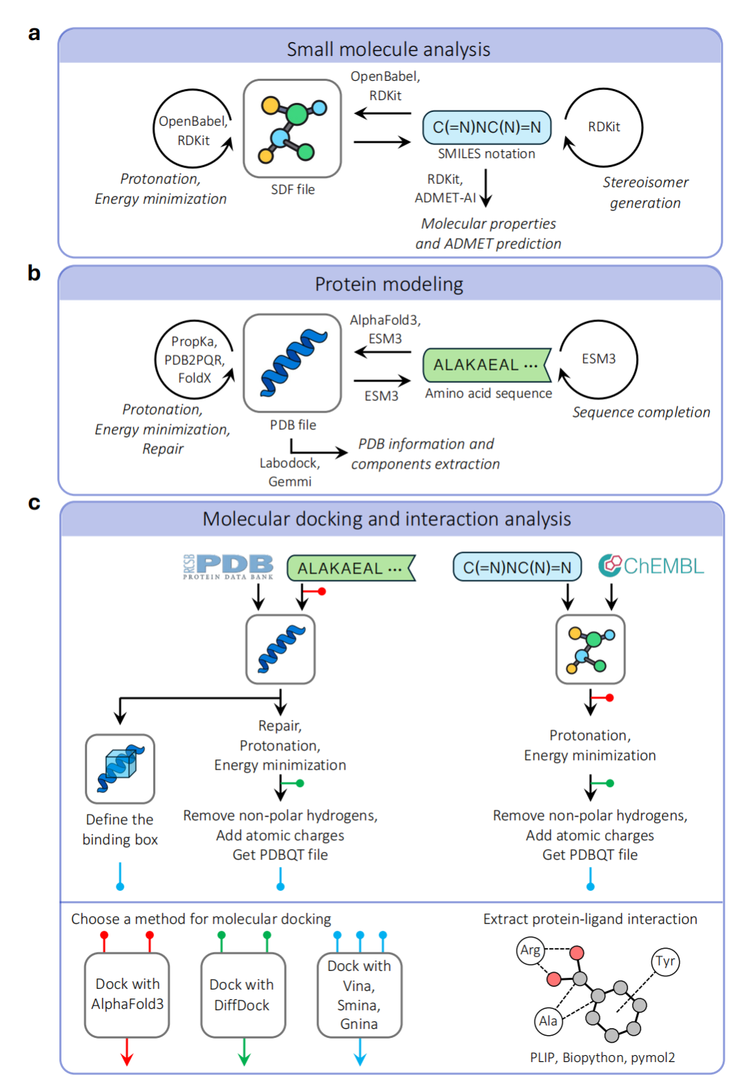 图2. BioChemAIgent工作流程示意图。(a)小分子分析:分析配体SMILES、由结构数据文件(SDF)提供的三维结构,并实现两者间的相互转换。(b)蛋白质建模:分析蛋白质序列、由蛋白质数据库(PDB)文件提供的蛋白质结构,并实现两者间的相互转换。(c)分子对接与相互作用分析:包括蛋白质和配体的预处理、使用不同方法(如Vina、Smina、Gnina、DiffDock和AlphaFold 3)进行对接,以及蛋白质-配体相互作用分析。