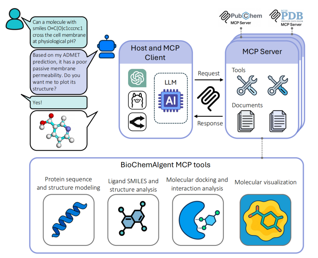 近年来,大语言模型(LLMs)与智能体(Agent)技术的兴起为解决上述问题提供了新思路。Agent具备自主规划任务、选择工具、协调执行的能力,而BioChemAIgent正是基于这一理念,通过Model Context Protocol(MCP)实现AI模型与专业工具的深度协同,其核心创新在于:以统一接口封装多样化工具,以透明化推理替代黑箱操作以社区化架构支撑持续迭代,最终实现 专家级流程自动化