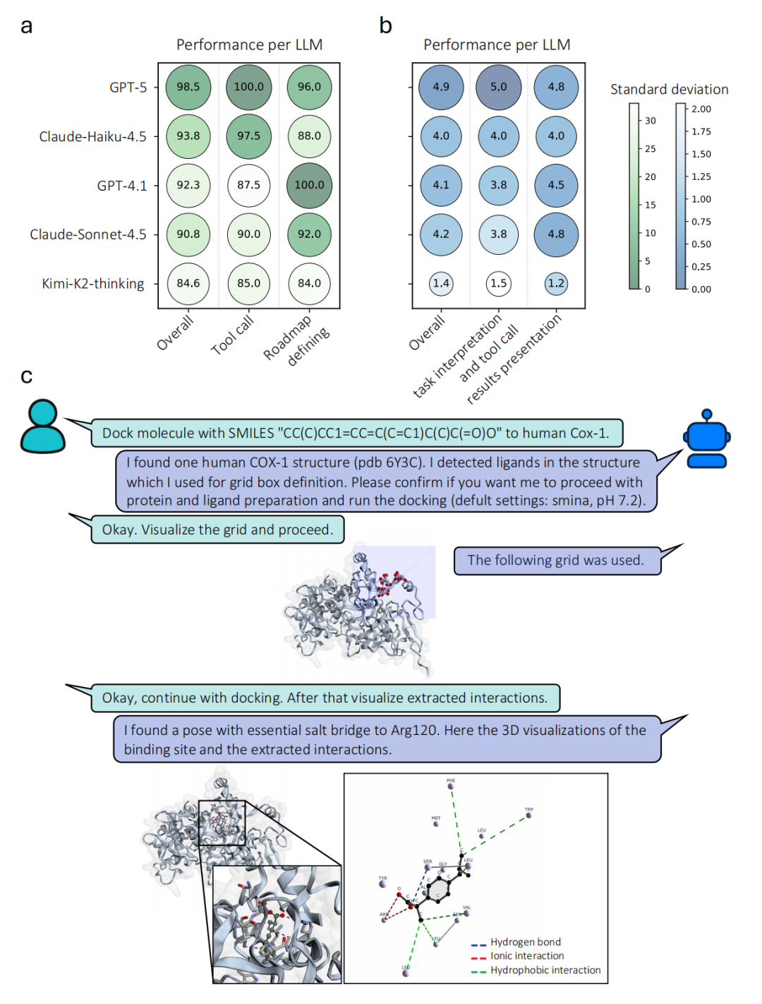 图3. BioChemAIgent的评估与演示。(a)基于大语言模型(LLM)的自动评估与(b)基于专家的人工评估在不同LLM间的性能比较。点的大小和颜色深度表示各任务得分的平均值和标准差。(c)用户与智能体就Cox-1与布洛芬分子对接任务进行对话的简化示意图。