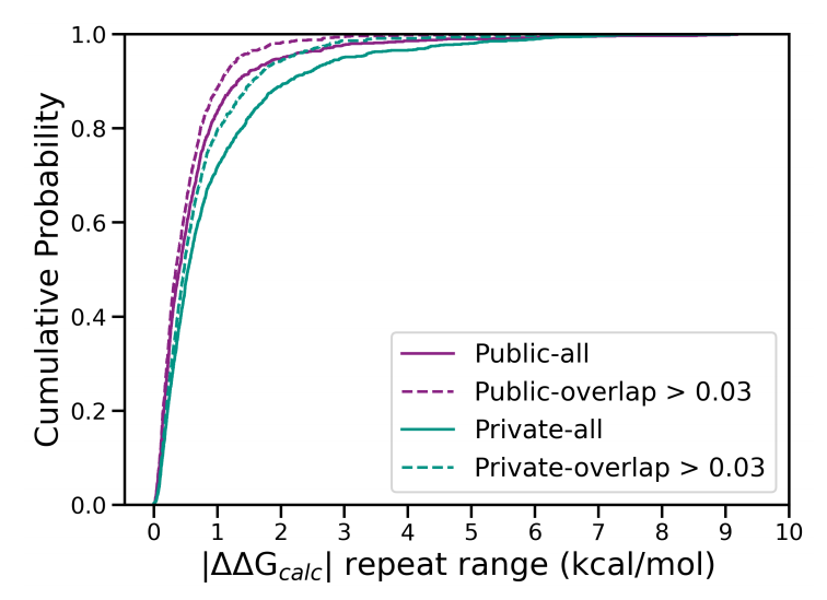 图9. OpenFE协议在公共和私有数据集上显示良好可重现性。 经验累积分布函数显示所有边(实线)和最小对角外MBAR重叠>0.03的边(虚线)的绝对重复间∆∆G估算。通过MBAR重叠过滤减少具有大重复间变异的异常边数量。