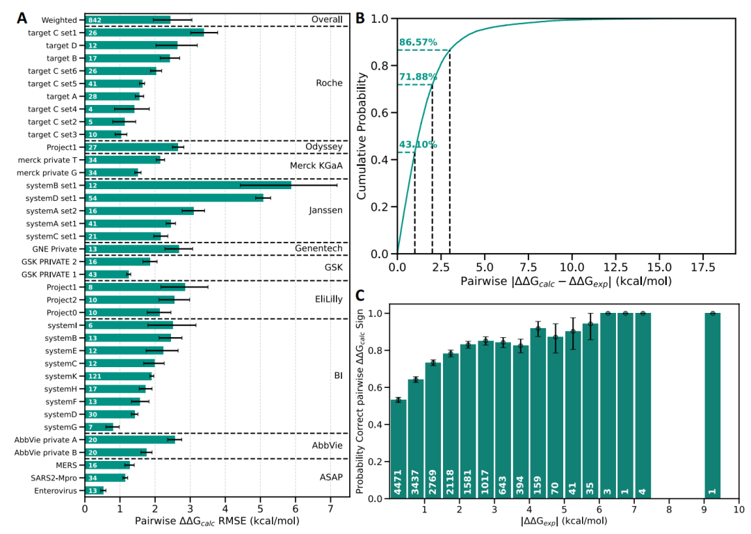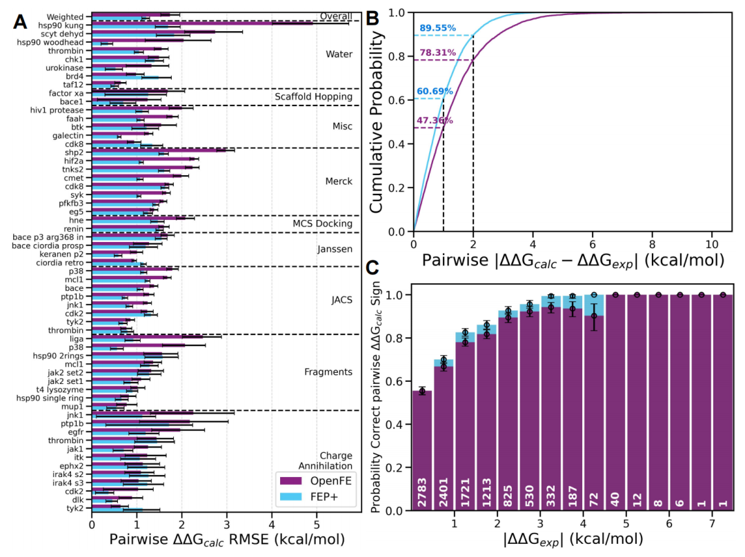 图2. OpenFE和FEP+ RBFE协议在Ross et al.公共数据集上的准确性指标比较。 A) 成对(所有对所有)∆∆G根均方误差,按系统和整体加权,附带通过自举获得的95%置信区间。 B) 绝对成对误差的经验累积分布函数。 C) 协议的成对∆∆G符号估算准确性,作为实验∆∆G幅度的函数,使用0.5 kcal/mol分箱,每个分箱基部显示比较数量。