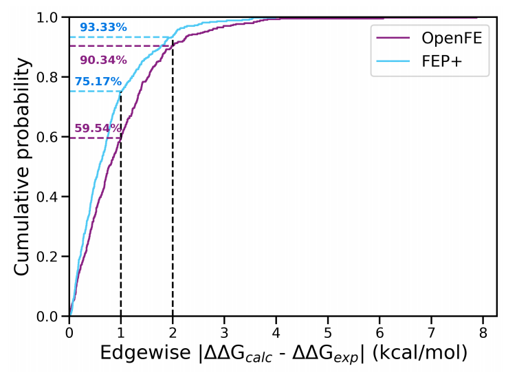 图4. 模拟边绝对边向∆∆G误差的经验累积分布显示OpenFE和FEP+协议,在1和2 kcal/mol处标线。 FEP+在435个重叠转化集上给出略更准确的∆∆G估算。虽然OpenFE亚kcal/mol估算少于FEP+,但在2 kcal/mol阈值下性能差异减小。