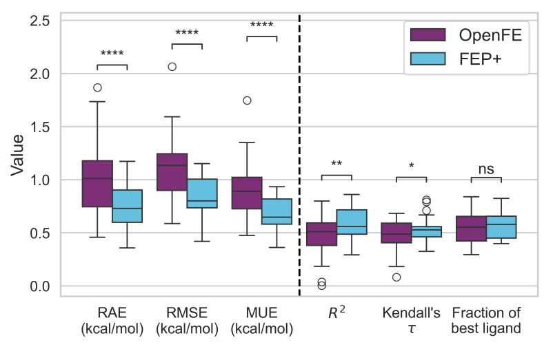 图3. 公共数据集上OpenFE与FEP+(Ross et al.)结果的偏差和相关统计比较。 仅纳入22个数据集,遵循Hahn et al.标准(至少16个配体,动态范围3 kcal/mol)。显示相对绝对误差(RAE)、根均方误差(RMSE)、平均无符号误差(MUE)、决定系数(R²)、Kendall’s τ以及最佳配体分数的箱线图。星号表示统计显著性(* p < 0.05;** p < 0.01;**** p < 0.0001;ns 无显著差异)。P值使用Wilcoxon检验获得。
