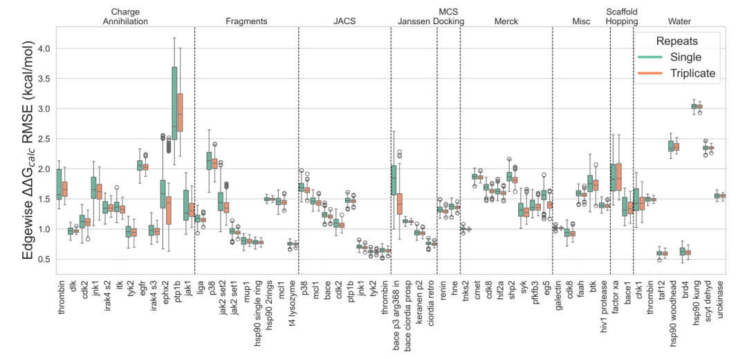 图10. 箱线图显示公共数据集代表性按系统边向∆∆G RMSE值分布,跨1000次自举复制,使用每个边一个或三个随机选择重复的平均。如预期,三重复模拟在大多案例中导致更窄误差分布,尽管中位RMSE值平均差异<0.1 kcal/mol。