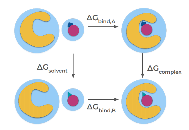图1. 计算两个相关配体间相对结合自由能的热力学循环。 通过炼金转化两个配体间差异原子,将一个配体转化为另一个配体。该转化同时在溶剂中()和结合位点中()进行,整体结合自由能差异。