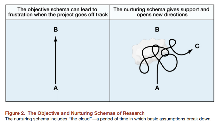 选择了问题之后会发生什么?在结束之前,我想讨论一下我们对研究将如何展开所持有的心理图式或模式(图2)。一种常见的图式体现在论文的写作方式上:从A点(问题)开始,沿着最短路径推进到B点(答案)。如果接受这种图式,危险在于将学生视为达到目的的手段(一支射向B的箭)。此外,对于那些持有这种图式的人,任何偏离路径的情况(实验不成功、学生情绪低落等)都是无法容忍的。偏离会引发压力,因为现实与心理图式之间产生了认知失调。