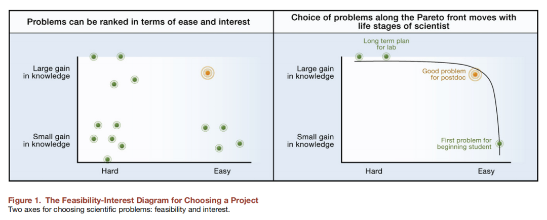 要决定在前沿上选择哪个问题,取决于我们如何权衡这两个轴。例如,一名刚入学的研究生需要一个容易的问题;这样可以快速获得积极反馈,增强信心。这些问题位于帕累托前沿的右下端。研究生阶段的第二个问题则可以沿着兴趣轴向上移动。博士后由于时间有限,需要右上象限的项目。刚开始独立领导课题组的首席研究员,需要选择一个能投入多年时间并用以培养学生的领域,可能会寻找一个能被分解成多个优秀小项目的宏大挑战。因此,最优问题会沿着帕累托前沿移动,这取决于科学家所处的职业阶段。