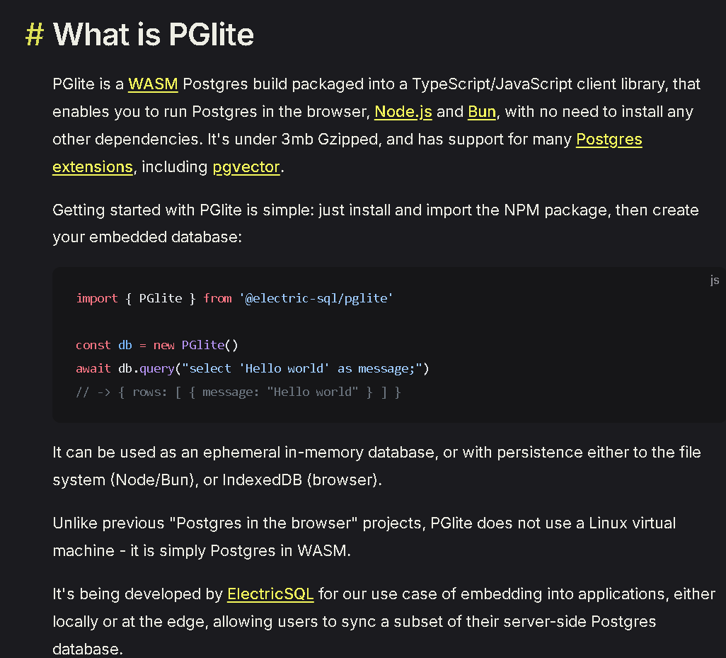 npm install @electric-sql/pgliteimport { PGlite } from "@electric-sql/pglite";