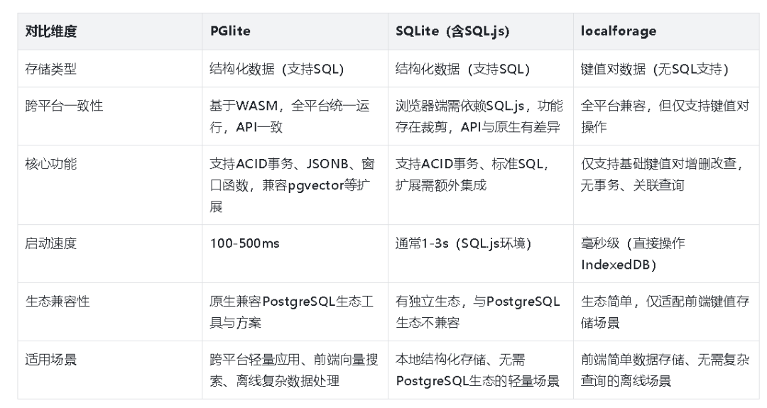 简言之,localforage适合简单键值存储场景,SQLite适合需要本地结构化存储但不依赖PostgreSQL生态的场景,而PGlite则聚焦“轻量部署+PostgreSQL全功能兼容”,填补了跨平台场景下企业级数据库能力的空白。