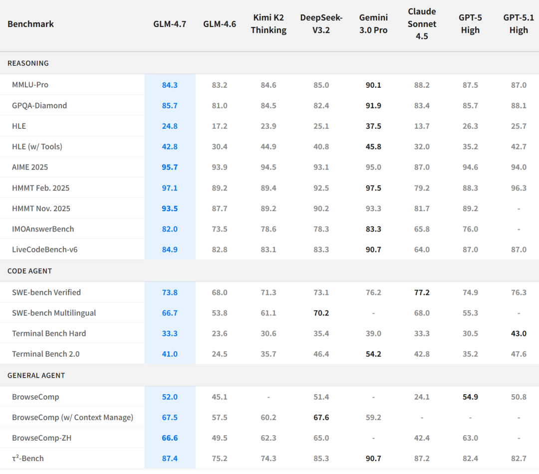 与 GPT-5、GPT-5.1-High、Claude Sonnet 4.5、Gemini 3.0 Pro、DeepSeek-V3.2、Kimi K2 Thinking 相比,GLM-4.7 也表现出色: