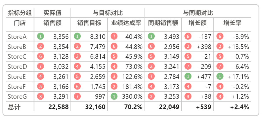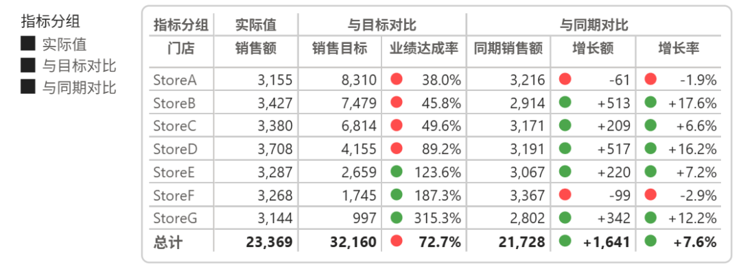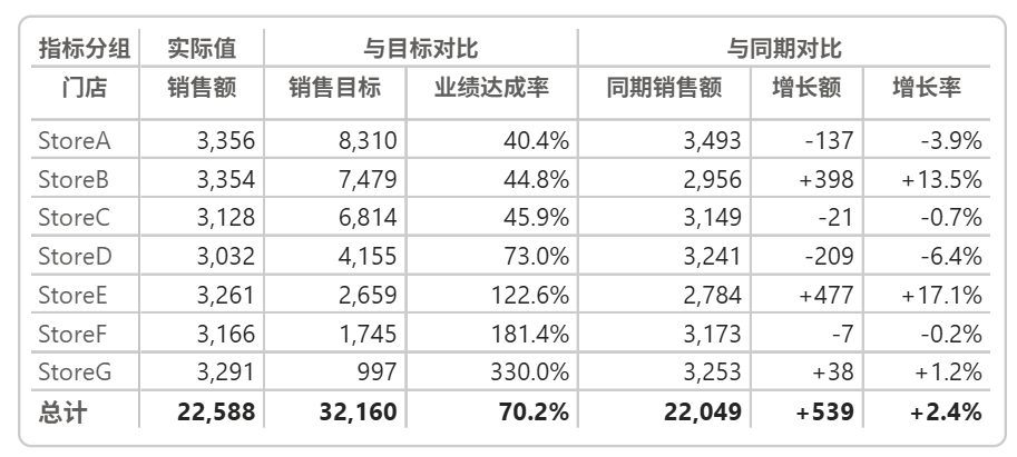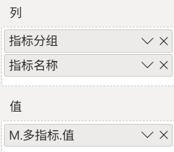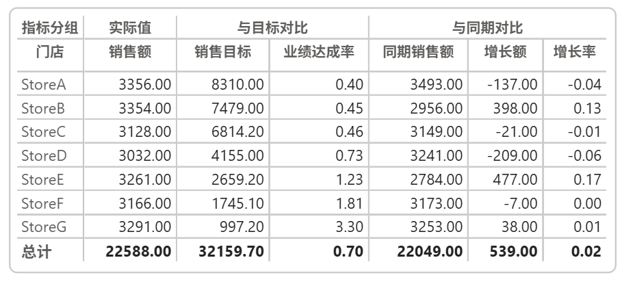 )矩阵如下拖拽字段,行为维度(此处是门店),列是上表中的指标分组和指标名称,值为[M.多指标.值]。