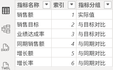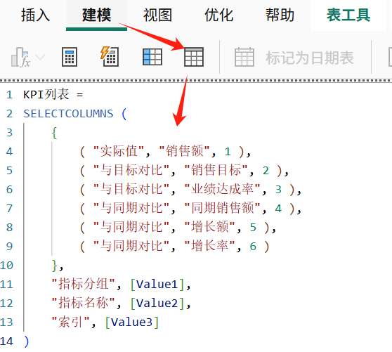 如果需要一次为多个指标同时设定格式,就放弃字段参数,转而使用虚拟表。在建模选项卡下输入以下公式创建表: