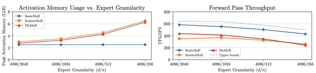 图 1: 即使专家粒度(d/n,其中 d 为嵌入维度,n 为专家中间维度)增加,SonicMoE 的每层激活显存占用(左图)仍保持恒定;相比其他基线,其显存效率提升了 0.20 倍至 1.59 倍。SonicMoE 的前向计算吞吐量(右图)平均达到了理论上限的 88%(最高 91%,最低 86%),该上限基于 H100 GPU 上的 「cuBLAS BMM + 激活函数 + cuBLAS BMM + 聚合操作」 计算得出。请注意,cuBLAS 上限基线未包含路由计算部分。在此,我们使用的是 30B 参数量的 MoE 配置,微批次大小为 32768 个 token,并且从左至右依次将「激活专家数 / 总专家数」设置为 2/32、4/64、8/128 和 16/256。