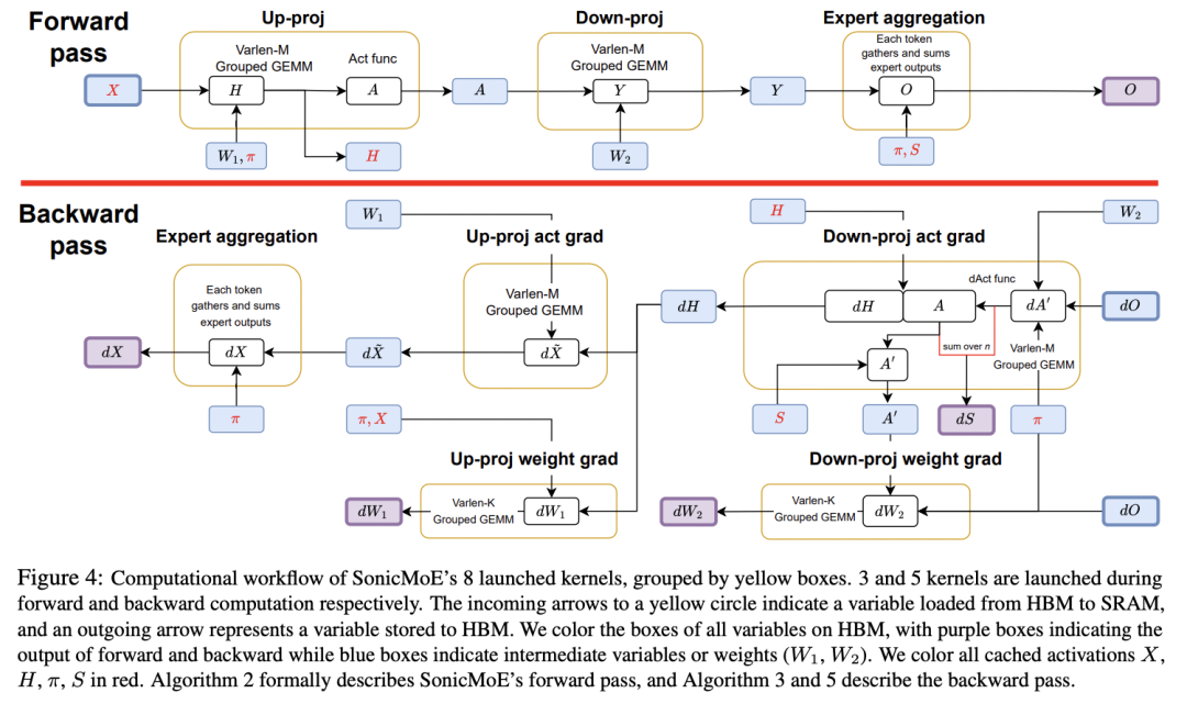 SonicMoE 中的 MoE 计算会启动 8 个内核:在前向传播过程中,包括 up-proj (A)、down-proj (Y) 和专家聚合 (O) 内核;在反向传播过程中,使用激活梯度内核,分别用于计算 dH(down-proj)、