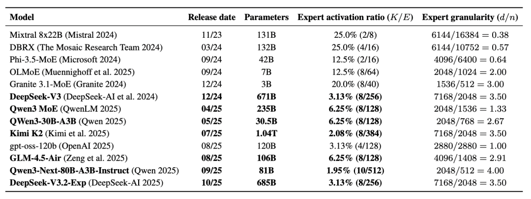 表 1:MoE 扩展趋势:在此,团队将激活率展示为每个 Token 激活的专家数 K / 专家总数 E;针对前沿开源模型,专家粒度展示为模型嵌入维度(d)/ 专家中间层大小(n)。在 MoE 稀疏度计算中未包含共享专家。趋势表明,新的开源 MoE 模型倾向于具备更高的粒度和稀疏度。