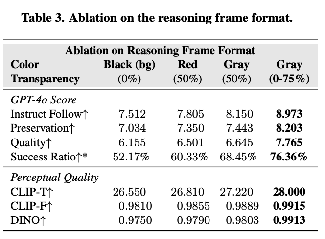 这有力地证明了:显式的时序推理(See-Reason-Edit)不仅是锦上添花,更是实现高精度视频编辑的关键。