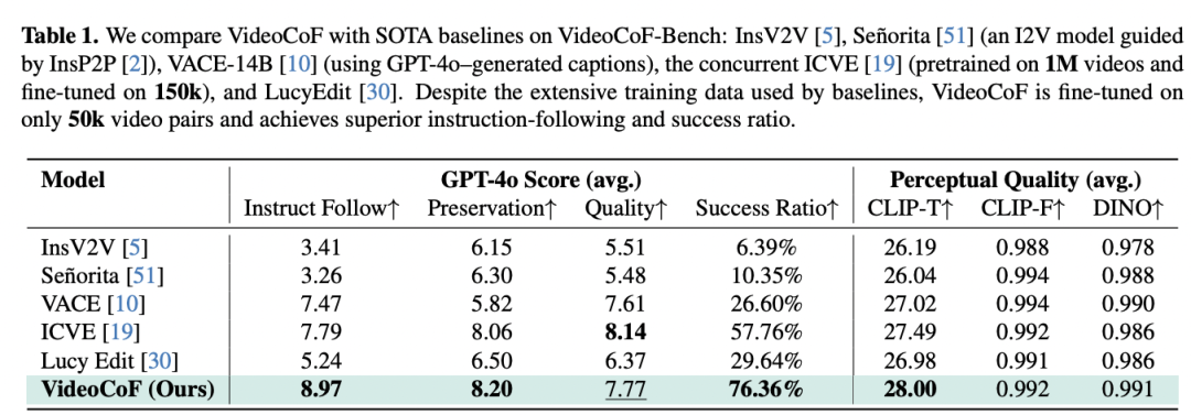 尽管训练数据量仅为基线的 1/20,VideoCoF 却实现了性能的反超: