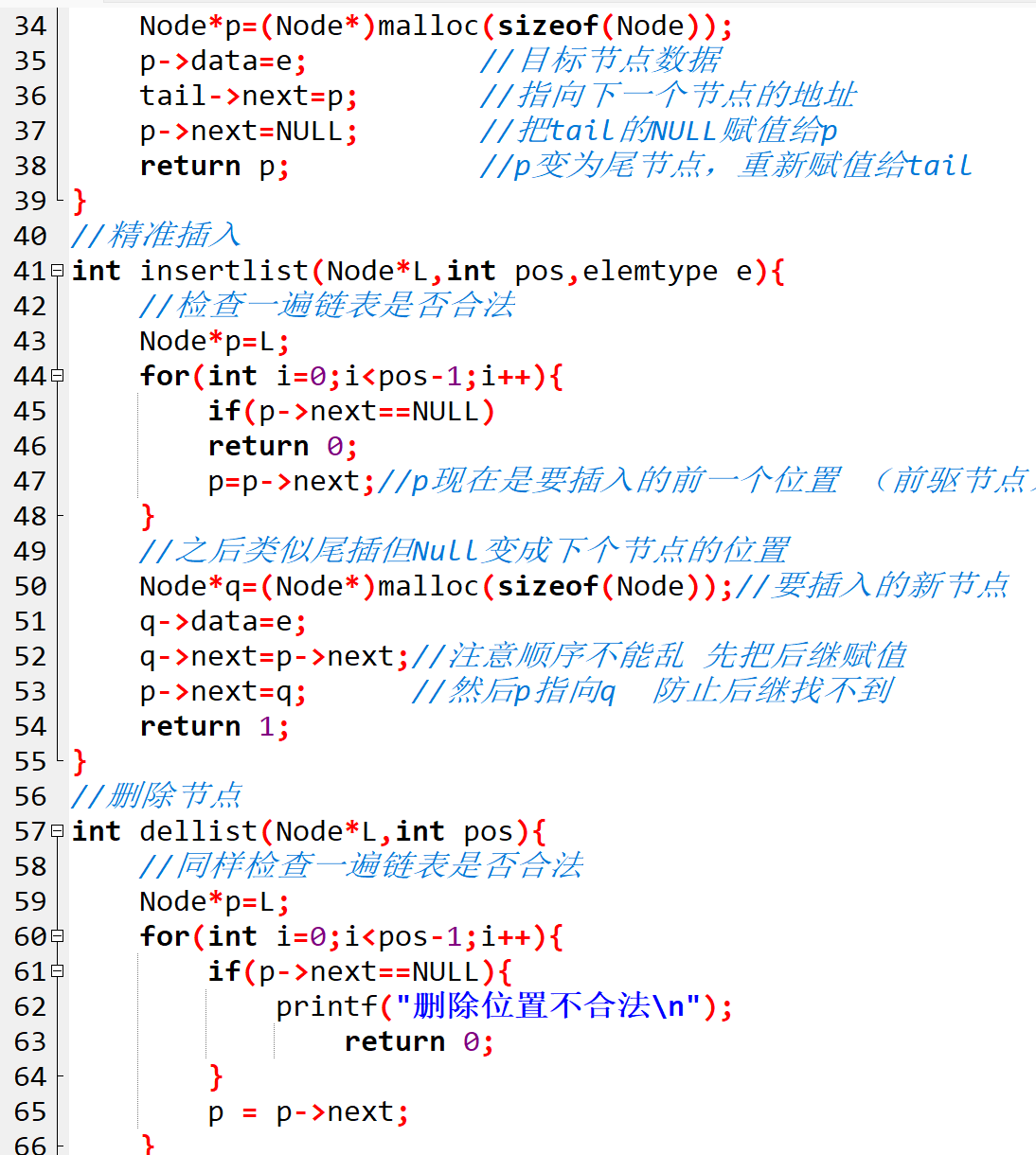 // 如果遍历过程中 p 的 next 为 NULL,说明 pos 超出了链表长度,删除位置不合法