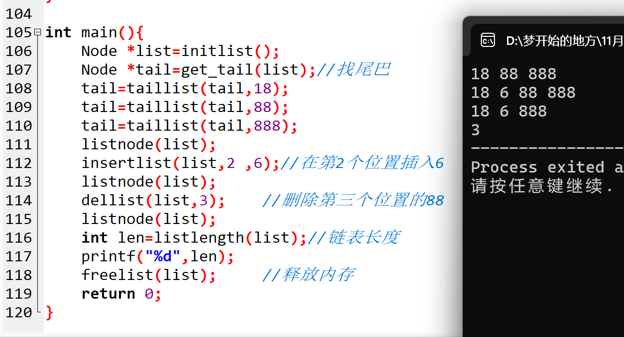 将上面的所有函数组合起来,再加上main函数(作为程序的入口,调用各个函数来操作链表),我们就得到了单链表的完整 C 语言实现代码。下面我们通过一个具体的例子,看看这条 “链子” 是如何 “动起来” 的: