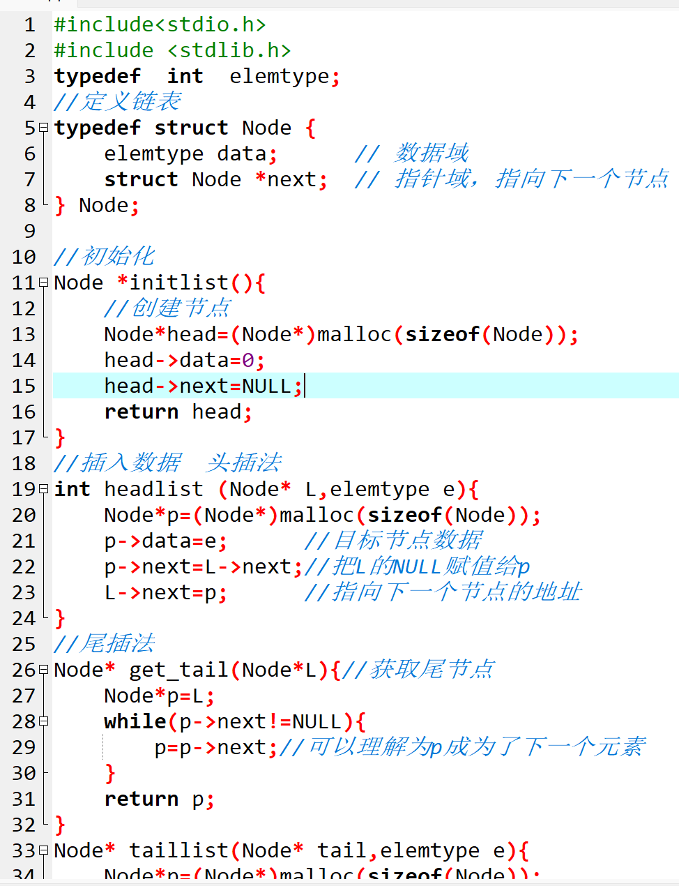 这里用typedef给结构体起了别名 “Node”,后续定义节点变量或指针时会更简洁。elemtype也是一个自定义类型,我们将其定义为int,如果后续需要存储其他类型(如float、char),只需修改typedef int elemtype;这一行即可,体现了代码的可扩展性。
