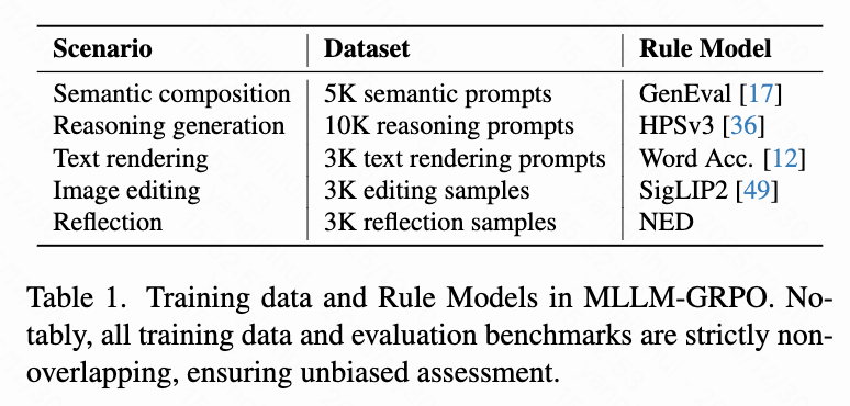 阶段4 MLLM-GRPO: 在此阶段,将 GRPO 应用于 MLLM,以鼓励生成与 DiT 偏好对齐的重写文本。本文在多个场景下优化 MLLM,以增强 CoT 推理的泛化能力。本文选择了五个代表性生成场景:语义组合、推理生成、文本渲染、图像编辑和反射。如下表1所示,针对每个场景,本文收集并整理了专用数据集,并设计了相应的规则模型来指导优化。对于 MLLM 的每个输入,本文从策略 执行 次 rollout 以生成轨迹 ,然后 DiT 使用这些轨迹生成相应的图像。规则模型用于计算每个轨迹的奖励 。随后,以组相对的方式计算第 个轨迹的优势 :