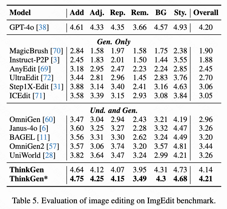 如下表5所示,在 ImgEdit 上,ThinkGen 与一系列开源模型相比,显示出显著优越的指标,取得了与 GPT-4o 相当的性能。