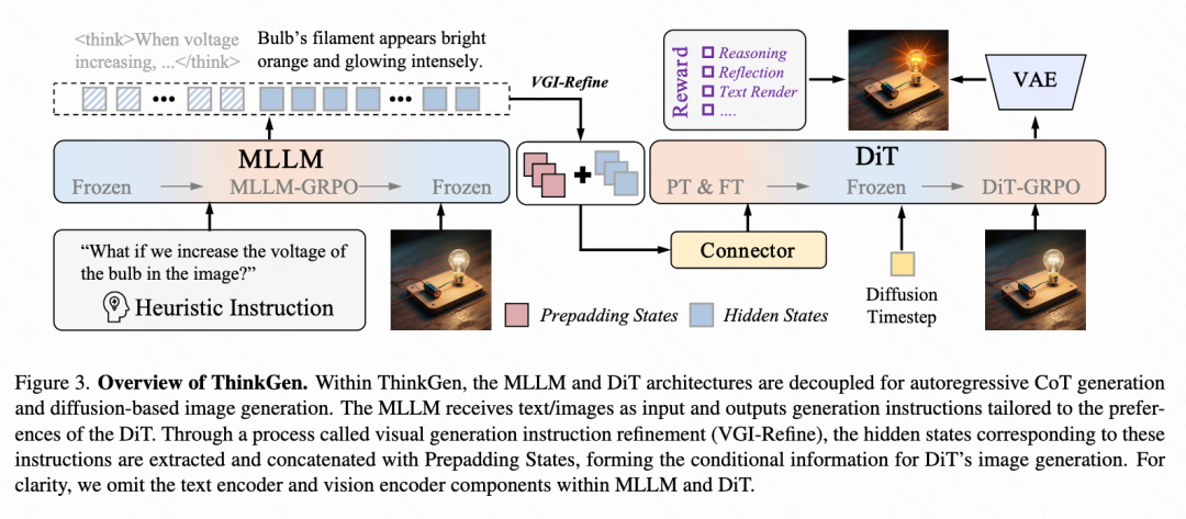 亮点直击 首次提出思考驱动的视觉生成框架: ThinkGen 是第一个显式利用 MLLM 的思维链(CoT)推理来处理各种生成场景的思考驱动视觉生成框架。这解决了现有方法在泛化性和适应性方面的局限性,因为它们通常针对特定场景设计 CoT 机制。解耦架构: ThinkGen 采用解耦架构,将预训练的 MLLM 和 Diffusion Transformer (DiT) 分开。其中,MLLM 负责根据用户意图生成定制指令,DiT 则根据这些指令生成高质量图像。这种设计克服了现有框架缺乏高级推理能力的问题。视觉生成指令提炼 (VGI-refine) 模块: 为了解决 CoT 推理过程中冗余信息的问题,提出了 VGI-refine 模块。该模块从 MLLM 的推理链中提取简洁的指令信息,并将其与可学习的 Prepadding States 连接起来,从而实现 MLLM 表示分布的自适应调整,更好地与 DiT 的要求对齐。可分离 GRPO-based 训练范式 (SepGRPO): 提出了一种名为 SepGRPO 的可分离强化学习训练范式,它在 MLLM 和 DiT 模块之间交替进行强化学习。这种灵活的设计支持在不同数据集上进行联合训练,从而促进了在广泛生成场景中有效的 CoT 推理。在多生成场景中实现 SOTA 性能: 广泛的实验证明,ThinkGen 在多个生成基准测试中实现了稳健的、最先进的性能,尤其是在推理密集型任务中表现出色。总结速览 解决的问题 现有的多模态大语言模型(MLLMs)在理解任务中展现了思维链(CoT)推理的有效性,但其在生成任务中的扩展仍然处于初级阶段。 现有针对生成任务的 CoT 机制通常是针对特定场景定制的,这限制了其泛化能力和适应性,导致在更广泛的任务中性能下降,并且通常需要手动干预来激活不同生成任务的 CoT 推理。 当前框架普遍缺乏高级推理能力。 提出的方案 本文提出了 ThinkGen ,这是一个通用且思考驱动的视觉生成框架,旨在显式地利用 MLLM 的 CoT 推理能力,以解决各种生成场景中的复杂任务。 通过解耦 MLLM 和 Diffusion Transformer (DiT) 的架构,实现了在生成之前制定高质量计划的能力。 应用的技术 解耦架构: 框架包含一个预训练的 MLLM(用于生成定制指令)和一个 Diffusion Transformer (DiT)(用于生成高质量图像)。思维链(CoT)推理: 显式地利用 MLLM 的 CoT 推理能力,通过生成明确的中间步骤来系统地解决复杂任务。视觉生成指令提炼 (VGI-refine): 引入 VGI-refine 模块,从 MLLM 的自回归 CoT 输出中筛选掉冗余信息,并结合可学习的 Prepadding States 进行对齐。可分离 GRPO-based 训练范式 (SepGRPO): 一种交替在 MLLM 和 DiT 模块之间进行强化学习的训练策略,旨在鼓励 MLLM 生成与 DiT 偏好对齐的指令,并使 DiT 基于这些指令生成高质量图像。达到的效果 在多个生成基准测试中实现了稳健的、最先进的性能。 ThinkGen 在采用 CoT 推理时,在广泛的生成场景中取得了卓越的性能(如下图1所示)。 实现了在多种生成场景下的有效 CoT 推理,从而增强了泛化能力。 架构方法 ThinkGen 采用解耦架构,包含一个预训练的 MLLM 和一个 Diffusion Transformer (DiT)。MLLM 负责根据用户意图生成定制指令,而 DiT 则根据这些指令生成高质量图像。这种解耦设计确保了每个组件的最佳性能,同时保持了系统的可扩展性和模块化,如下图3所示。