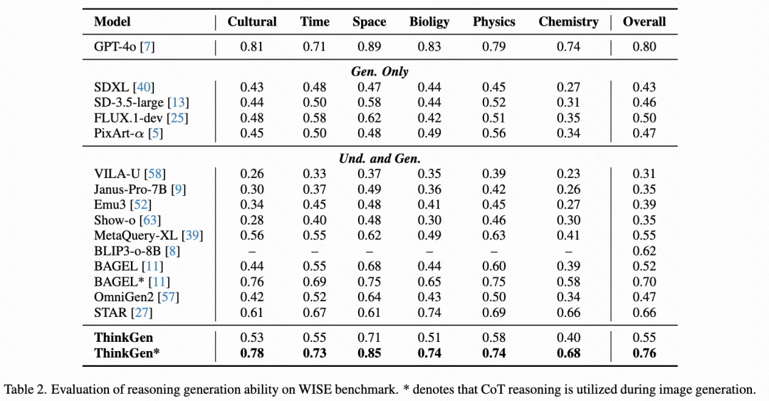 如下表2所示,在 WISEBench 基准测试中,ThinkGen 表现出优于直接生成方法的显著优势。通过利用 CoT 推理,ThinkGen 实现了 +21% (0.55 → 0.76) 的显著改进,并在 WISEBench 上建立了新的最先进性能。