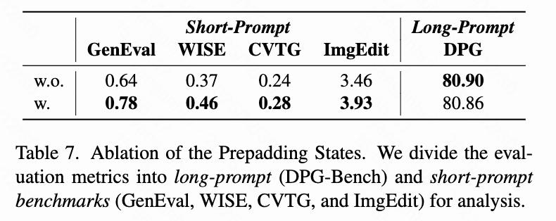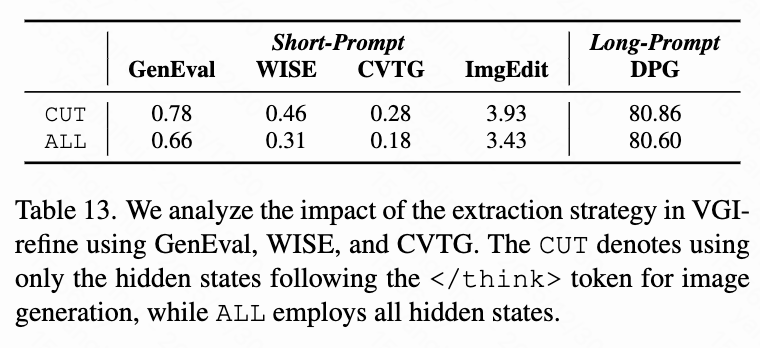 VGI-refine 为了解决 MLLM 自回归思维链(CoT)输出中存在的冗余信息,本文引入了视觉生成指令提炼(VGI-refine)模块,包含两个步骤。首先,从 MLLM 生成的文本标记中提取 </think> 特殊标记之后的指令标记,从而分离出用于下游图像生成的必要 CoT 结果。其次,将 K 个可学习的 Prepadding States 连接到提取的指令标记上。这种连接调节了输出隐藏状态的数据分布,尤其对于短指令(例如,“生成一只狗”或“移除猫”)特别有益。最终得到的精炼指令状态作为条件输入提供给 DiT。