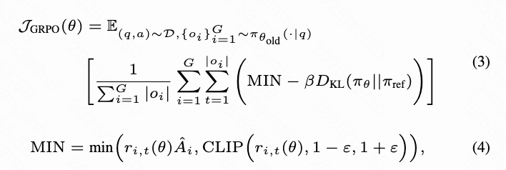 然后通过优化 GRPO 目标来更新策略 ,该目标是带有 KL 散度正则化的裁剪替代函数: